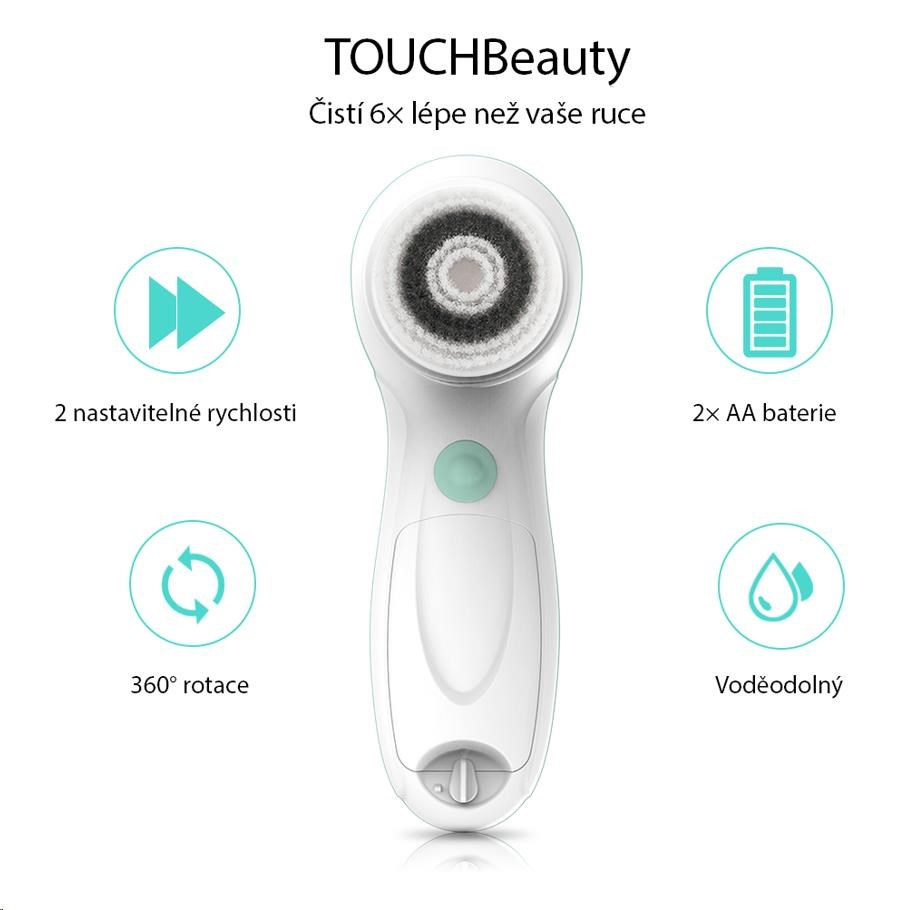 Elektrická čistiaca kefka TOUCHBeauty 0759 ponúka tri rôzne nástavce, ktoré odstraňujú make-up, hĺbkovo čistia pleť a pomáhajú s peelingom. Dve pracovné rýchlosti a veľká ergonomická rukoväť zaisťujú maximálny komfort pri každodennom používaní. Vďaka vodoodolnému prevedeniu je čistenie prístroja hračkou. Praktické puzdro sa hodí nielen pre ukladanie prístroje a nástavcov, ale aj pre cestovanie.