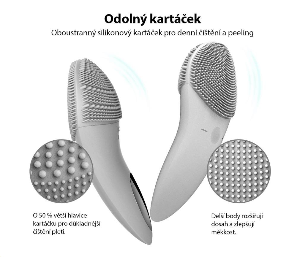 Každodenná čistiace plocha je vybavená jemnými silikónovými dotykovými bodmi, ktoré čistia tvár bez poškodenia pokožky.
