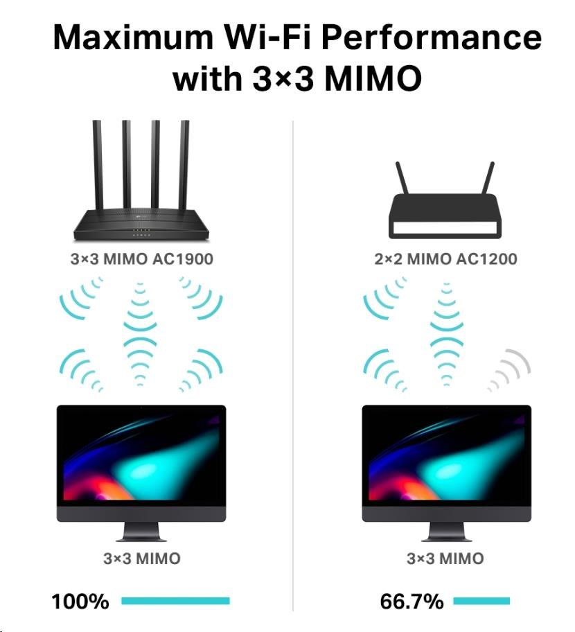 - 3×3 MIMO technológia – Prenos a príjem dát vo troch prúdoch pre bezproblémové spárovanie s vašimi 3 × 3 klientmi.