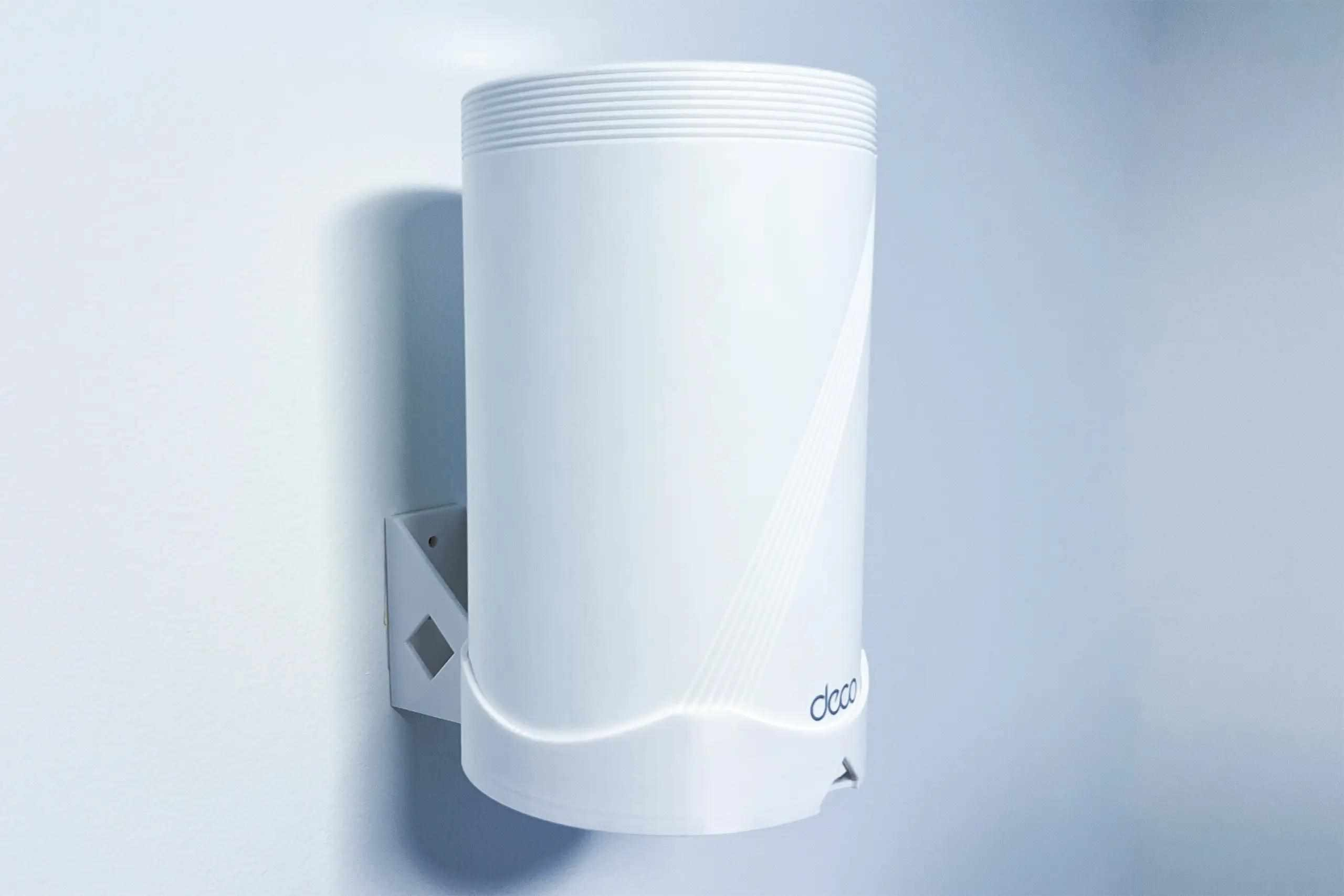 Plastový držák na stěnu pro TP-Link DECO BE65, DECO BE68 na stěnu a to pomocí dvou šroubů. Držák je vyroben z PETG materiálu na 3D tiskárně a má bílou barvu.