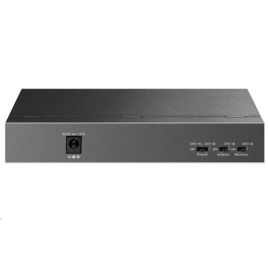 | Pokročilé vlastnosti | • Tlačidlo Mode Extend (porty 1–4/1–8, až 250 m napájanie PoE a prenos dát) • Tlačidlo režimu izolácie (porty 1–8) • Tlačidlo Auto Recovery PoE (porty 1–8) • Kompatibilný s PD IEEE 802.3af/at • Automatické učenie MAC adries a ich automatické vymazanie • IEEE 802.3x riadenie prietoku • Zelená technológia |