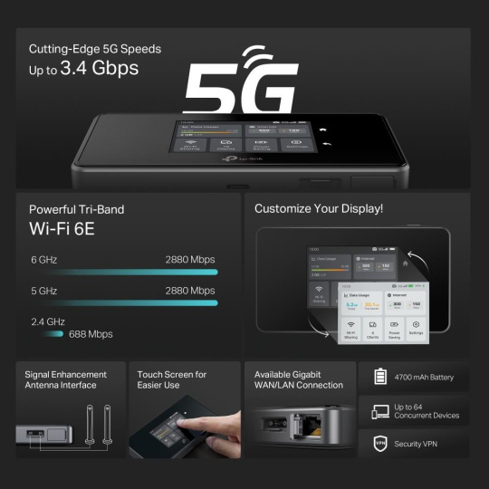 | Package Content | 5G AXE3600 Mobile Router M8550 Napájací adaptér USB-C kábel 4680 mAh batéria Rýchly návod na inštaláciu |