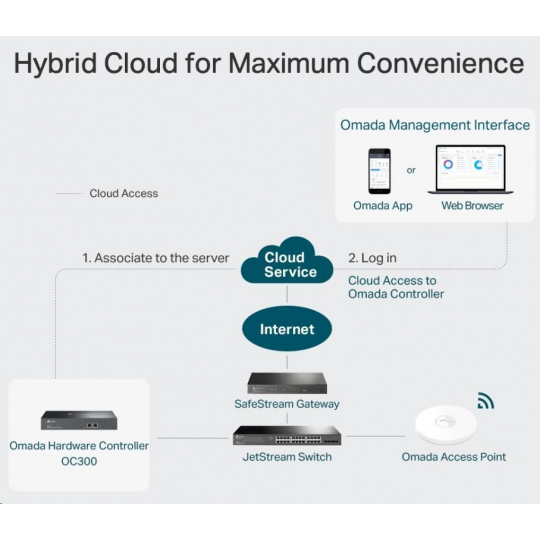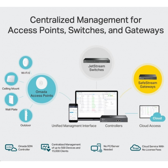 - Centralizovaná správa - až 500 prístupových bodov Omada, 100 JetStream switchov a 100 SafeStream smerovačov.