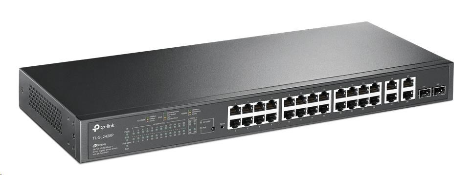 Inteligentný switch TP-Link TL-SL2428P je vybavený 24 portami RJ45 10/100 Mbit/s, 4 portami RJ45 10/100/1 000 Mbit/s a 2 kombinovanými gigabitovými SFP zásuvkami. Všetkých 24 portov RJ45 10/100 Mbit/s podporuje štandard 802.3at/af (PoE+) s celkovým rozpočtom napájania PoE 250 W* a užitočnými funkciami riadenia spotreby PoE. Switch poskytuje vysoký výkon, technológiu QoS na podnikovej úrovni, užitočné stratégie zabezpečenia a bohaté funkcie správy na 2. vrstve.