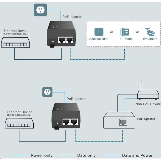 Injektor PoE+ POE160S úplne vyhovuje štandardu IEEE 802.3af/at a podporuje všetky adaptéry prijímača PD alebo PoE kompatibilné so štandardom IEEE 802.3af/at PoE, napríklad TP-Link POE10R alebo iné podobné produkty a rozširuje vašu sieť tam, kde nie je elektrické vedenie či zásuvka na pripojenie zariadení, ako sú prístupové body, IP kamery, IP telefóny a podobne.