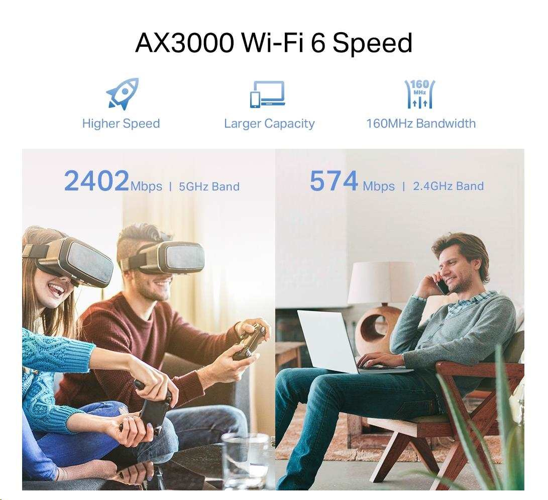 - Dvoupásmová sieť Wi-Fi 6 - oddelené pásma 5 GHz (2 402 Mbit/s) a 2,4 GHz (574 Mbit/s) siete Wi-Fi prinášajú vďaka najnovším technológiám vyššiu rýchlosť a väčšiu priepustnosť.