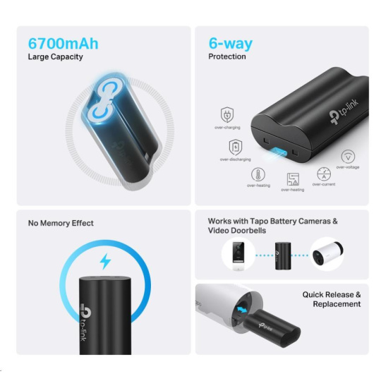- 6700mAh Veľká kapacita – Predlžuje dobu používania (až 180 dní) vašich kamier Tapo napájaných batériou a videozvonov.