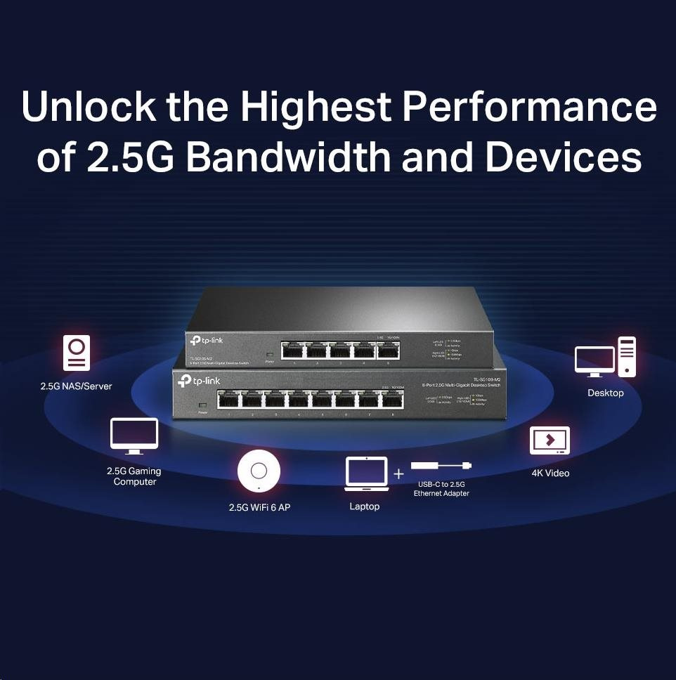 - Osem portov 2,5 Gbit/s. - Osem 2,5gigabitových portov umožňuje využiť najvyšší výkon multigigabitovej šírky pásma a vašich zariadení, a poskytuje kapacitu prepínania až 40 Gbit/s.