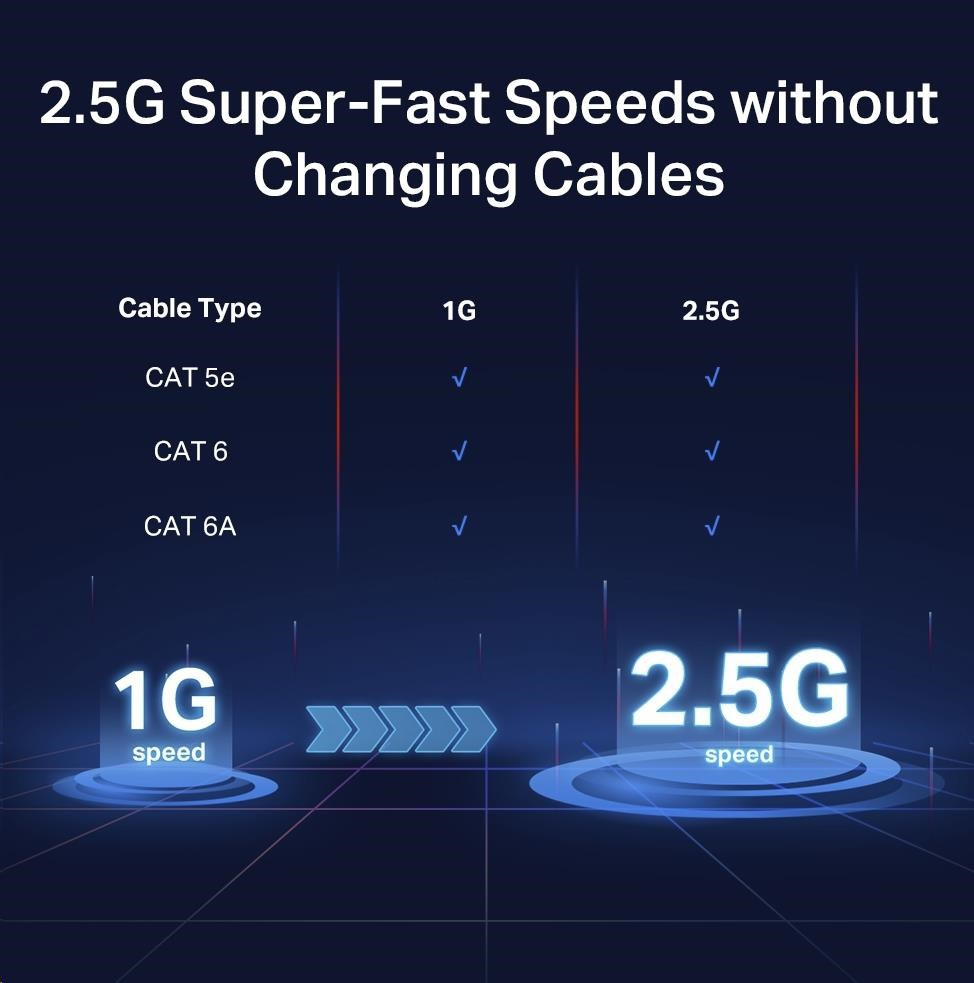 - Bezproblémové použitie káblov - Ihneď zvýšte rýchlosť siete na 2,5 Gbit/s bez nutnosti výmeny káblov za káble štandardu Cat6, čím ušetríte peniaze aj námahu.