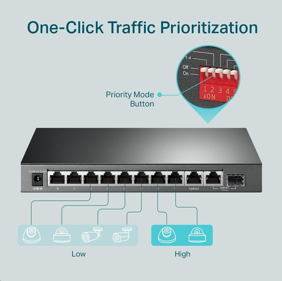 TP-Link CCTV switch TL-SG1210MP (8xGbE, 1xGbE uplink, 1xGbE/SFP combo uplink, 8x PoE+, 123W, fanless)