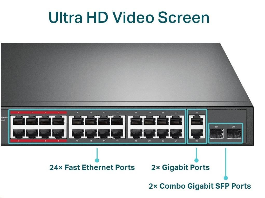 | Rozhranie | 24× PoE+ 10/100 Mbps RJ45 portov 2× 10/100/1000 Mbps RJ45 portov 2× Combo gigabitové SFP sloty |