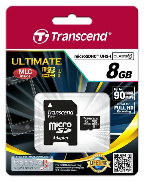 Karta TRANSCEND MicroSDHC 8GB Ultimate, Class 10 UHS-I 600x, MLC + adaptér