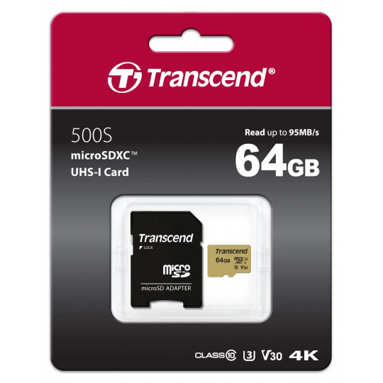 Karta TRANSCEND MicroSDXC 64GB 500S, UHS-I U3 V30 + adaptér