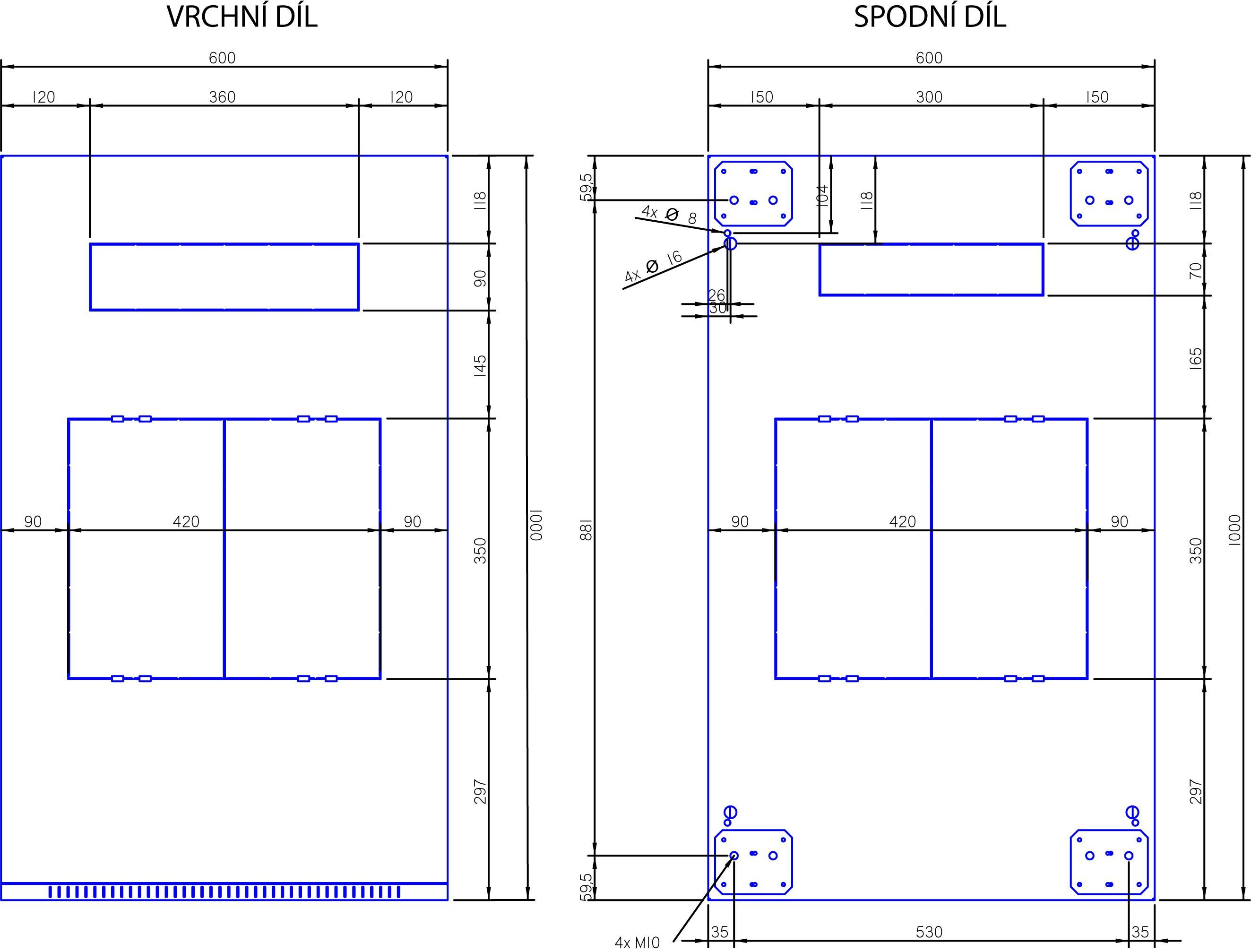Materiál: Ocelový plech, bezpečnostné kalené sklo hrúbky 4 mm, plastové diely, spojovací materiál.