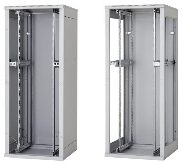 (platí pre šírku stojana 800 mm). Systém umožňuje inštaláciu posuvných vertikálnych koľajníc v rozpätiach 19", 21" a 23", presne podľa požiadaviek inštalovaného zariadenia.