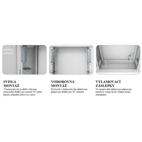 Hybridný rozvádzač SHA - IP20, nosnosť 30 kg. Rozvádzač je určený na montáž na omietku (model SHA) JEDNODUCHÁ INŠTALÁCIA Horná polovica skrine je vybavená posuvnými držiakmi na montáž 19" patch panelov alebo vane s ističom. MONTÁŽ VODIČOV Na bočných stranách v dolnej polovici skrine sú držiaky pre 19" zariadenia. BREAK-outs v strope a na dne skrine sú pripravené káblové vstupy zakryté break-outs...