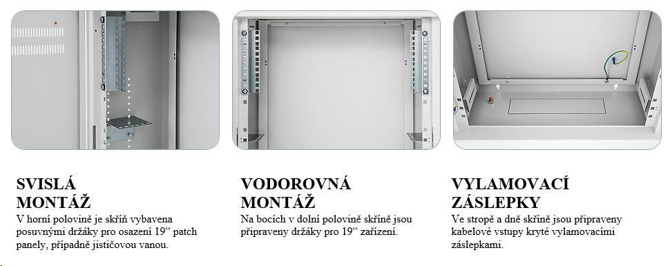 Hybridný rozvádzač SHA - IP20, nosnosť 30 kg. Rozvádzač je určený na montáž na omietku (model SHA) JEDNODUCHÁ INŠTALÁCIA Horná polovica skrine je vybavená posuvnými držiakmi na montáž 19" patch panelov alebo vane s ističom. MONTÁŽ VODIČOV Na bočných stranách v dolnej polovici skrine sú držiaky pre 19" zariadenia. BREAK-outs v strope a na dne skrine sú pripravené káblové vstupy zakryté break-outs...