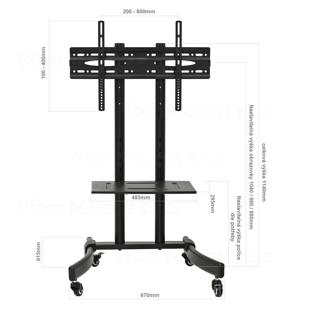 Podlahový stojan na TV pojazdný Fiber Mounts M7C39 Podlahový pojazdný stojan na televízory 32" až 65", nastaviteľná výška televízie 89/96/114cm, polička 485x295mm, pojazdný, VESA 200x100 až 600x400, nosnosť 40kg Pekný stojan na televízory s uhlopriečkou 32-65". Stojan má pevnú robustnú konštrukciu, zavešenie televízie je spoľahlivé a bezpečné. Vďaka kolieskam je manipulácia so stojanom jednoduchá a pohodlná, aretácia zabezpečí stojan na mieste. Stojan dodávame vrátane poličky na príslušenstvo, na ktorú môžete dať notebook, počítač, hernú konzolu alebo prehrávač. Konštrukcia umožňuje 3 výškové polohy obrazovky, rovnako tak môžete upraviť aj výšku poličky. Držiak podporuje VESA štandardy 200x100 až 600x400 pre upevnenie televízie. Nosnosť stojanu je 40kg. Záručná doba 5 rokov. Podlahový pojazdný stojan na televízor Fiber Mounts M7C39 Technické údaje: nosnosť 40kg na televízory a monitory s uhlopriečkou 32" až 65" podporuje VESA štandardy 200x100 až 600x400 celková výška stojanu bez obrazovky 1140mm výškové nastavenie obrazovky 880 / 960 / 1040mm (výška po stred obrazovky) polička na príslušenstvo 485x295mm nastavenie výšky poličky pojazdové kolieska s aretáciou pevná konštrukcia vynikajúca stabilita a bezpečnosť farebné prevedenie čierne záručná doba 5 rokov Pojazdný stojan s nastaviteľnou výškou televízie a výškou poličky Fiber Mounts M7C39 Televízny stojan M7C39 podporuje VESA štandardy: VESA 200x100 VESA 200x200 VESA 300x200 a 200x300 VESA 300x300 VESA 400x200 a 200x400 VESA 400x300 a 300x400 VESA 400x400 VESA 600x400