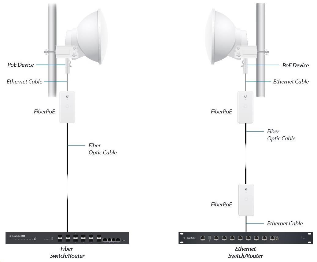 uBNT FiberPOE G2 je cenovo dostupný gigabitový vonkajší konvertor z optického vlákna na kov, ktorý okrem konverzie dát z optického vlákna na kovový kábel dokáže zabezpečiť aj napájanie prostredníctvom PoE. V porovnaní s prvou generáciou vydrží väčší rozsah teplôt (-40 až 60 °C).