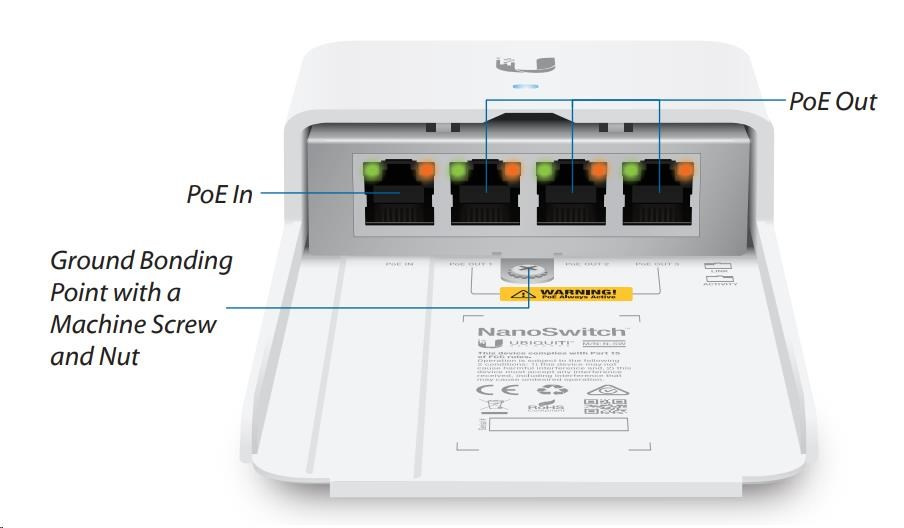 zvyšné 3 porty sa používajú na napájanie ďalších zariadení s podporou 24 V pasívneho gigabitového PoE s 2-párovým napájaním (štandard pre NanoStation, PowerBeam, AirGrid atď.). Prepínač dokáže dodať max. celkovo 24 W pre všetky tri výstupné porty PoE. Technické údaje: