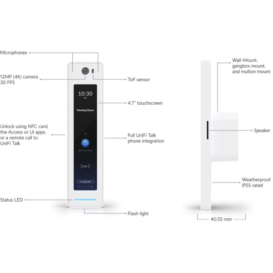 Popis produktu UniFi Access Reader G2 Professional je čtečka NFC s dotykovým displejem na zadání přístupového PINu a je součástí řešení UniFi Access. Čtečka pro komunikuje s ostatními prvky používá LAN port s podporou 802.3af PoE, snadno se instaluje pod omítku, má stupeň krytí IP55 a podporuje nejnovější bezpečnostní standardy NFC (13.56 MHz) včetně šifrování MIFARE DESFire šifrovaného pomocí AES-128. Odemknutí dveří je rychlé a bezpečné pomocí karty NFC nebo mobilní aplikace. Podporované technologie čtení • NFC Tag 1, 2, 3, 4, 5 • MIFARE Classic • MIFARE Plus • MIFARE Ultralight • MIFARE DESFire Důležité vlatnosti • Elegantní NFC a Bluetooth přístupová čtečka (UniFi identita) • Napájení pomocí 802.3af PoE pomocí UniFi Access Hubu • Pokročilé NFC zabezpečení (MIFARE DESFire) • Odemknutí pomocí PINu na dotykové obrazovce • IP55 krytí proti vodě • Mobilní přístup s aplikací (1.5.9+) Obsah balení • Zařízení (UA-G2-Pro) • Montážní krabička do zdi • Šroubky Technické parametry Obraz Rozlišení kamery:12MP Konektory a rozhraní Technologie čtení:Mifare (13.56 MHz) Audio:Mikrofon, Reproduktor Rychlost LAN:(1) 10/100/1000Mbps Napájení Napájení přes PoE:802.3af Typ napájení:PoE Max. spotřeba energie [W]:6 Fyzické charakteristiky Stupeň krytí:IP55 Tlačítka:Reset Provozní teplota [°C]:-10 až 40 Hmotnost [g]:136 Šířka [mm]:40 Výška [mm]:160 Hloubka [mm]:41.