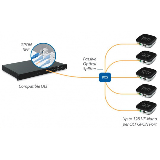 uF-NANO je kompaktný, ale robustne skonštruovaný koncový bod GPON s LED displejom, ktorý zobrazuje aktuálnu priepustnosť/IP adresu a stav ethernetového a optického spojenia. Rýchlosť linky PON je maximálna (Rx/Tx) 2.488 / 1.244 Gb/s, rýchlosť siete Ethernet je 10/100/1000 Mb/s a samotné zariadenie je možné napájať len prostredníctvom 24V pasívneho adaptéra PoE. Zariadenie ako také sa používa na konverziu metalického pripojenia na optické a dokáže pracovať iba v režime Bridge, nie v režime Router.