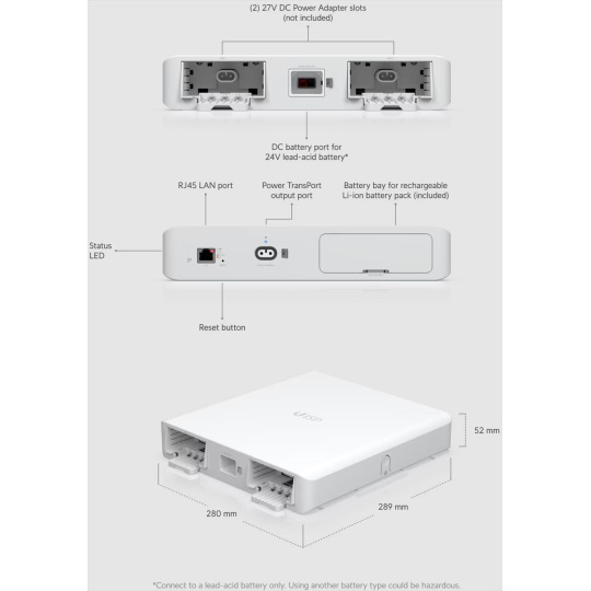 Popis produktu Nepřerušitelný systém napájení je vyvinutý pro zálohané napájení dalších produktů ze série UISP, která zahrnuje routery a switche. Samostatně prodávaný propojovací kabel UACC-Cable-PT je dostupný v různých délkách od 0.5m až do 50m a kabely různých délek je také možné spojovat pomocí venkovní kabelové spojky UACC-Cable-PT-Ext. UISP-P lze napájet jedním nebo dvěma zdroji UACC-Adapter-PT-120W, které jsou k zakoupení samostatně. Přiopjením jednoho zdroje získáte výstupní výkon 100W, se dvěma zdroji je pak možné využít dvojnásobný výkon 200W. Pro funkci zálohovoání je součástí balení Li-ion battery pack s výkonem 115 Wh a externě lze připojit také olověnou baterii s napětím 24V. Pro připojení do datové sítě slouží jeden ethernetový port 10/100Mbps. Konfigurace a správa zařízení probíhá v aplikaci UISP, které je dostupná pro iOS a Android. Kompatibilní zařízení: • UISP-Console • UISP-R (instalovaný v UISP-Box) • UISP-R-Pro • UISP-S (instalovaný v UISP-Box) • UISP-S-Pro Obsah balení • Záložní zdroj • Li-ion battery pack • Vrtací šablona • Držák na zeď • (4) Šrouby a hmoždinky • Zajišťovací šroubek • Propojovaví kabel externí baterie Technické parametry Napájení Funkce nabíjení:Ano Výkon [W]:200 Výstupní napětí [V]:27 Výstupní proud [A]:7,4 Fyzické charakteristiky Provozní teplota [°C]:-5 až 40 Hmotnost [g]:1400 Šířka [mm]:280 Výška [mm]:52 Hloubka [mm]:289.