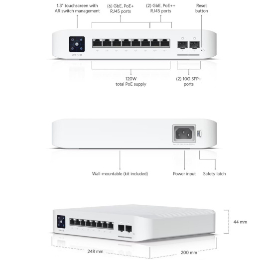 Popis produktu Ubiquiti USW-Pro-8-PoE je novým switchem, který nabízí až 6 POE/POE+ portů, schopných dodávat až 30 W, a také 2 POE++ porty, které dokážou dodávat až 60 W. Celkový maximální výstupní výkon je 120 W. Switch má 2 SFP+ porty s rychlostí až 10 Gb/s, což je ideální pro přenos i větších souborů. Na přední straně switche najdete dotykový ovládací panel i s AR nastavením. Switch lze také upevnit na zeď pomocí příslušného držáku. Klíčové vlastnosti • Podpora nejnovější POE++ • Velmi rychlé SFP+ porty až 10 Gb/s • Podpora L3 • Dostupnost až 120W pro POE • Možnost připevnění na zeď Technické parametry Konektory a rozhraní Rychlost LAN:(8) 10/100/1000Mbps Optické rozhraní:(2) 1G/10Gbps Ostatní:Dotykový displej Napájení Typ napájení:Ze sítě (230V) Typy PoE:PoE-Out (pouze) Podporované PoE-Out standardy:802.3af, 802.3at, 802.3at - ultra PoE (60W) Počet PoE Out portů:8 PoE budget [W]:120 Max. spotřeba energie [W]:150 Napájení přes konektor/svorkovnici:230V AC (přímo do zásuvky) Fyzické charakteristiky Provedení:Desktop Ventilátory:Bez ventilátoru Šasi:Plastové Tlačítka:Reset Provozní teplota [°C]:-5 až 45 Šířka [mm]:248 Výška [mm]:200 Hloubka [mm]:44 Obecné Rychlost přepínání [Gbps]:56 Software Management:UniFi controller Funkce:L3 Výchozí IP adresa:Dynamická z DHCP.
