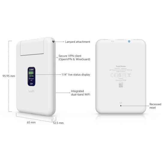 Popis produktu Ubiquiti UniFi Travel Router je ultra-kompaktní cestovní dual-band Wi-Fi 5 router pracující současně v pásmech 2,4GHz a 5GHz pro dosažení maximální propustnosti až 1,17Gbps, který je dále vybaven (2) 1Gbit porty a intuitivním displejem. Router může sdílet mobilní data z telefonu nebo proměnit veřejnou Wi-Fi síť na soukromou. Díky funkci Teleport lze snadno vytvořit zabezpečený VPN tunel zpět do vaší UniFi sítě odkudkoliv. Klíčové vlastnosti • (2) 1Gbit porty (1x LAN, 1x LAN/WAN) a dual-band Wi-Fi 5 • Celková propustnost až 1,17Gbps - 300Mbps na 2,4GHz (2x2) a 867Mbps na 5GHz (2x2) • USB tethering - sdílení mobilních dat z telefonu přes USB-C • Teleport - WireGuard VPN připojení k UniFi gateway bez potřeby konfigurace • Napájení přes dedikovaný USB-C port • Bezdráty • WiFi Routery • WiFi 5 Ubiquiti UTR, Cestovní Dual-Band Wi-Fi 5 router +6 dalších Novinka Vaše cena bez DPH 1 430 Kč 1 545 Kč Recyklační poplatek 1.70 Kč Vaše cena s RP 1 432 Kč Vaše cena s DPH (21%) 1 733 Kč Očekáváme 10.3.2026 PlzeňOčekáváme 10.3.2026 Dostupnost na našich pobočkách Přidat do košíku Výrobce Ubiquiti Kód 10904731 Part No. UTR Záruka 24 měsíců Stránky výrobce PorovnatDotaz na produktDo oblíbenýchHlídatNavrhnout úpravu • Související produkty3 MikroTik MT13-052400-E15BG, napájecí adaptér 5V 2.4A, 12W, pro hAP ax lite MT13-052400-E15BG 107 Kč bez DPH Skladem 23 ks Masterlan patch kabel UTP, Cat5e, 1m, žlutý PCU5E-1YW-MS 8 Kč bez DPH Skladem > 99 ks Masterlan comfort patch kabel UTP, Cat5e, 5m, šedý PCU5E-5-MSC 46 Kč bez DPH Skladem 85 ks Ke stažení GPSR Popis produktu Ubiquiti UniFi Travel Router je ultra-kompaktní cestovní dual-band Wi-Fi 5 router pracující současně v pásmech 2,4GHz a 5GHz pro dosažení maximální propustnosti až 1,17Gbps, který je dále vybaven (2) 1Gbit porty a intuitivním displejem. Router může sdílet mobilní data z telefonu nebo proměnit veřejnou Wi-Fi síť na soukromou. Díky funkci Teleport lze snadno vytvořit zabezpečený VPN tunel zpět do vaší UniFi sítě odkudkoliv. Klíčové vlastnosti • (2) 1Gbit porty (1x LAN, 1x LAN/WAN) a dual-band Wi-Fi 5 • Celková propustnost až 1,17Gbps - 300Mbps na 2,4GHz (2x2) a 867Mbps na 5GHz (2x2) • USB tethering - sdílení mobilních dat z telefonu přes USB-C • Teleport - WireGuard VPN připojení k UniFi gateway bez potřeby konfigurace • Napájení přes dedikovaný USB-C port Zařízení je spravováno lokálně pomocí webového rozhraní a výrobce nabízí také vzdálenou správu pomocí portálu UniFi Mobility Manager, která je ale výrobcem zpoplatněna. Obsah balení • Zařízení • USB-C - USB-C kabel Technické parametry Bezdrátové vlastnosti Bezdrátové frekvence:2.4 + 5 GHz (dual band), Bluetooth WiFi standardy:802.11n, 802.11a, 802.11ac, 802.11b/g Přenosová rychlost - 5GHz [Mb/s]:866 Přenosová rychlost - 2.4GHz [Mb/s]:300 Vysílací výkon 2.4GHz [dBm]:13 Vysílací výkon 5GHz [dBm]:13 2.4GHz MIMO:2 x 2 5GHz MIMO:2 x 2 Typ antény:Vestavěná Počet vestavěných antén:2 Konektory a rozhraní Počet portů USB-C:2 Rychlost LAN:(1) 10/100/1000Mbps + (1) 10/100/1000Mbps LAN/WAN Gigabit LAN:Ano USB:Ano Ostatní:LCD displej, Bluetooth Napájení Typ napájení:USB-C Max. spotřeba energie [W]:5 Fyzické charakteristiky Použití:Vnitřní Tlačítka:Reset Provozní teplota [°C]:-10 až 40 Hmotnost [g]:89 Šířka [mm]:65 Výška [mm]:96 Hloubka [mm]:13 Software Podporované VPN:OpenVPN, WireGuard Operační mód:AP Router.