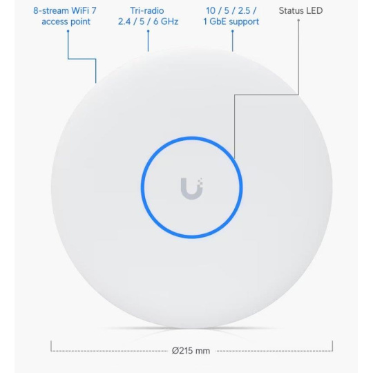 Popis produktu Ubiquiti U7 Pro XGS je nový WiFi 7 UniFi AP. Jedná se o tri-band access point s rychlostí přenosu 5,8Gbps v pásmu 6GHz, až 8,6Gbps v 5GHz pásmu a až 688 Mbps v pásmu 2,4GHz a pokročilým šifrováním WPA3. U7-Pro-XGS je určeno k WiFi pokrytí vaší domácnosti, kanceláře, hotelových prostor nebo skladu s podporou až 500+ připojených klientů. Plná podpora roamingu zajišťuje plynulé předávání připojených klientů mezi jednotlivými AP. Pro připojení do sítě je AP vybaveno 10G ETH portem, který slouží i pro napájení pomocí PoE 802.3at nebo pasivním PoE v rozsahu 42,5-57V DC, PoE injektor není součástí balení. Výhody UniFi řešení • Roaming - přechod mezi jednotlivými AP bez výpadků • Wireless uplink – ideální pro místa, kam nelze přivést datový kabel • Až 8 SSID • Detailní statistiky provozu • Guest síť • Load balancing - udržování rovnoměné zátěže / přepínání klientů • Omezování rychlosti pro každé SSID Obsah balení • Zařízení • Kit k přichycení na strop • Sada šroubků Technické parametry Bezdrátové vlastnosti Bezdrátové frekvence:2.4 + 5 + 6 GHz (triple band) WiFi standardy:802.11n, 802.11a, 802.11ac, 802.11b/g, 802.11ax, 802.11be MU-MIMO:Ano Přenosová rychlost - 5GHz [Mb/s]:8600 Přenosová rychlost - 2.4GHz [Mb/s]:688 Přenosová rychlost - 6GHz [Mb/s]:5800 Vysílací výkon 2.4GHz [dBm]:23 Vysílací výkon 5GHz [dBm]:29 Vysílací výkon 6GHz [dBm]:24 Šifrování:WPA, WPA2, WPA3 2.4GHz MIMO:2 x 2 5GHz MIMO:4 x 4 6GHz MIMO:2 x 2 Typ antény:Vestavěná Počet vestavěných antén:8 Roaming:Ano Zisk antény [dBi]:6, 4 Konektory a rozhraní Rychlost LAN:(1) 100M/1G/2.5G/5G/10G Gigabit LAN:Ano Napájení Napájení přes PoE:802.3at, 42 .. 57V DC Typy PoE:PoE-In (pouze) Max. spotřeba energie [W]:29 Fyzické charakteristiky Použití:Vnitřní Tlačítka:Reset Provozní teplota [°C]:-30 až 40 Hmotnost [g]:800 Šířka [mm]:215 Výška [mm]:215 Hloubka [mm]:33 Software Operační mód:Access Point Výchozí IP adresa:192.168.1.20, Dynamická z DHCP.