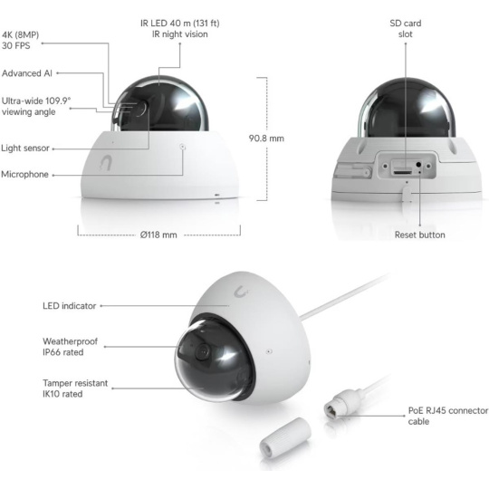 Popis produktu Venkovní 4K PoE Dome kamera s vylepšenou AI pro rozpoznávání osob a registračních značek, dlouhým dosahem nočního IR vidění a ochranou vůči nepříznivému počasí. Kamera snímá 8 Mpx video (3840 x 2160) při 30 snímcích za sekundu s fixním 2.8mm objektivem Klíčové vlastnosti 4K (8 MP) rozlišení Úhel záběru - 109.9° horizontálně, 134.1° diagonálně, 56.7° vertikálně Vestavěné IR LED diody a automatický IR cut filtr pro lepší noční vidění (40m) Voděodolnost IP66 + odolnost IK10 (antivandal) Mikrofon (lze vypnout) Antivandal ochrana IK10 Micro SD (minimálně 64 GB) Napájení přes PoE (42.5-57V DC) Obsah balení Zařízení Montážní příslušenství Technické parametry Kamera Typ objektivu:Fixní Objektiv [mm]:2,8 (fixní) Přísvit:IR Dosah přísvitu [m]:40 Pozorovací úhel [°]:110 Režim den/noc:IR cut filtr Obrazový senzor ["]:1/1.8 Bezdrátové vlastnosti Typ antény:Fixní Obraz Rozlišení:8MP Max. rozlišení [pixely]:3840 x 2160 (4K UHD) Konektory a rozhraní Slot na paměťové karty:microSD Audio:Mikrofon Napájení Napájení přes PoE:42 .. 57V DC Typ napájení:PoE Max. spotřeba energie [W]:10 Fyzické charakteristiky Stupeň krytí:IP66 Použití:Venkovní Antivandal (ochrana proti nárazu):IK10 Tlačítka:Reset Provozní teplota [°C]:-30 až 50 Hmotnost [g]:700 Šířka [mm]:118 Výška [mm]:91 Hloubka [mm]:118 Barva:Bílá Obecné Kamerová řada:UniFi Protect Technologie a vymoženosti:Face capture, Čtení SPZ Software Výchozí IP adresa:192.168.1.20, Dynamická z DHCP Výchozí jméno a heslo:ubnt / ubnt.