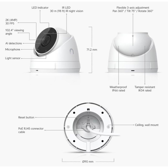 Popis produktu UVC-G5-Turret-Ultra je kamera 5. generace z řady UniFi Video. Disponuje snímačem 1/2.4" CMOS s rozlišením 4MP (2688 x 1512 px, 16:9) @ 30 FPS. Fixní objektiv má pozorovací úhel 102,4° horizontálně, 54,9° vertikálně a 120,6° diagonálně. Kamera je vybavena mikrofonem (lze zakázat) a (1) 10/100Mbps ethernetovým portem, skrze který se kamera napájí za použití POE 802.3af nebo pasivní POE se vstupním napětím 37 - 57 V DC. Pro noční režim je kamera vybavena IR přísvitem s dosahem 30 m. Maximální spotřeba činí pouhé 4 W! Obsah balení Kamera Voděodolná průchodka Kovový držák Sada šroubů a matic s metrickým závitem Sada vrutů a hmoždinek Vrtací šablona Bezpečnostní závlačka Technické parametry Kamera Typ objektivu:Fixní Přísvit:IR Dosah přísvitu [m]:30 Pozorovací úhel [°]:102 Režim den/noc:IR cut filtr Obrazový senzor ["]:1/2.4 Obraz Rozlišení:4MP Max. rozlišení [pixely]:2688 x 1512 Konektory a rozhraní Audio:Mikrofon Rychlost LAN:(1) 10/100Mbps Napájení Napájení přes PoE:802.3af, 37 .. 57V DC Typ napájení:PoE Max. spotřeba energie [W]:4 Fyzické charakteristiky Stupeň krytí:IP66 Použití:Venkovní Antivandal (ochrana proti nárazu):IK4 Tlačítka:Reset Provozní teplota [°C]:-30 až 50 Hmotnost [g]:330 Šířka [mm]:90 Výška [mm]:71 Hloubka [mm]:90 Barva:Bílá Obecné Kamerová řada:UniFi Protect.