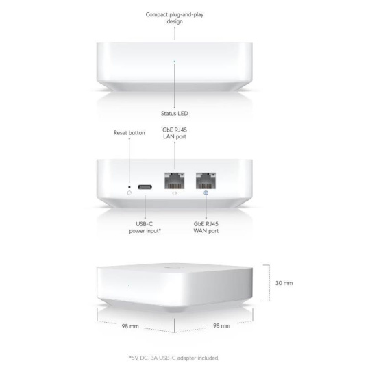 Popis produktu UniFi Gateway Lite je novinkou od společnosti Ubiquiti. UniFi Gateway Lite je tichá, kompaktní, výkonná brána UniFi s kompletní sadou pokročilých funkcí routování a zabezpečení. Zařízení je vybaveno 1x Gigabit LAN konektorem a 1x Gigabit WAN konektorem. Tento produkt se skvěle hodí pro malé firmy, pro které vytváří skvělý balanc mezi cenou a výkonem zařízení. Pro základní správu zařízení je možné využít smartphone s Bluetooth, komplexní správa probíhá stejně jako u jiných UniFi zařízeních skrze HW/SW kontroler. Unifi Gateway Lite je až 10X rychlejší oproti USG a podporuje různé druhy VPN, stejně tak IPv6, DHCP server a mnohem více. Klíčové vlastnosti • Kompaktní rozměry • Jednoduchá instalace • Správa pomocí UniFi Network Aplikace • Tichý chod bez ventilátoru Obsah balení • Zařízení • Napájecí adaptér Technické parametry Konektory a rozhraní Rychlosti WAN:(1) 10/100/1000Mbps Rychlost LAN:(1) 10/100/1000Mbps Gigabit LAN:Ano Napájení Typ napájení:USB-C Max. spotřeba energie [W]:3,8 Fyzické charakteristiky Provedení:Desktop Ventilátory:Bez ventilátoru Šasi:Plastové Tlačítka:Reset Provozní teplota [°C]:-10 až 40 Šířka [mm]:98 Výška [mm]:30 Hloubka [mm]:98 Hardware CPU:ARM Cortex-A53 Frekvence CPU [MHz]:1000 Počet CPU jader:2 RAM [MB]:1024 Software Podporované VPN:L2TP, OpenVPN, WireGuard Management:UniFi controller Podpora IPv6:Ano.
