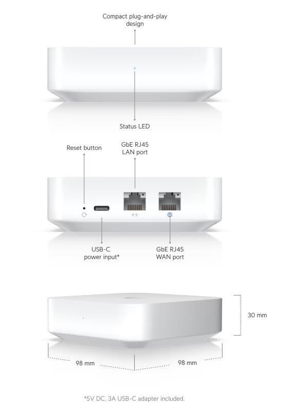 Popis produktu UniFi Gateway Lite je novinkou od společnosti Ubiquiti. UniFi Gateway Lite je tichá, kompaktní, výkonná brána UniFi s kompletní sadou pokročilých funkcí routování a zabezpečení. Zařízení je vybaveno 1x Gigabit LAN konektorem a 1x Gigabit WAN konektorem. Tento produkt se skvěle hodí pro malé firmy, pro které vytváří skvělý balanc mezi cenou a výkonem zařízení. Pro základní správu zařízení je možné využít smartphone s Bluetooth, komplexní správa probíhá stejně jako u jiných UniFi zařízeních skrze HW/SW kontroler. Unifi Gateway Lite je až 10X rychlejší oproti USG a podporuje různé druhy VPN, stejně tak IPv6, DHCP server a mnohem více. Klíčové vlastnosti • Kompaktní rozměry • Jednoduchá instalace • Správa pomocí UniFi Network Aplikace • Tichý chod bez ventilátoru Obsah balení • Zařízení • Napájecí adaptér Technické parametry Konektory a rozhraní Rychlosti WAN:(1) 10/100/1000Mbps Rychlost LAN:(1) 10/100/1000Mbps Gigabit LAN:Ano Napájení Typ napájení:USB-C Max. spotřeba energie [W]:3,8 Fyzické charakteristiky Provedení:Desktop Ventilátory:Bez ventilátoru Šasi:Plastové Tlačítka:Reset Provozní teplota [°C]:-10 až 40 Šířka [mm]:98 Výška [mm]:30 Hloubka [mm]:98 Hardware CPU:ARM Cortex-A53 Frekvence CPU [MHz]:1000 Počet CPU jader:2 RAM [MB]:1024 Software Podporované VPN:L2TP, OpenVPN, WireGuard Management:UniFi controller Podpora IPv6:Ano.