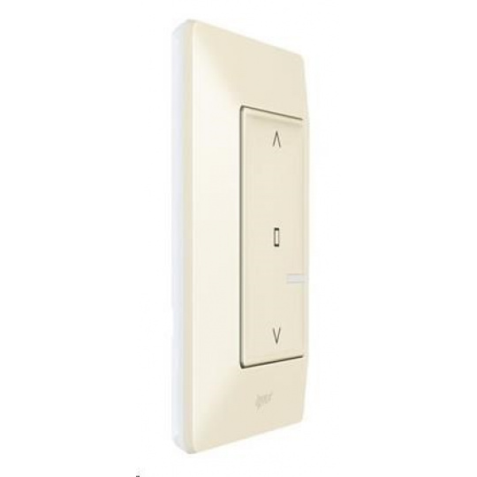 Valena Life s bezdrôtovým spínačom žalúzií Netatmo na ovládanie až 20 káblových spínačov žalúzií (batéria CR2032 a obojstranná lepenka sú súčasťou dodávky). Zadná strana je úplne plochá (možno ju pripevniť na stenu, sklo, nábytok pomocou skrutiek alebo obojstrannej lepenky) - farba béžová, dodáva sa s rámom v béžovej farbe