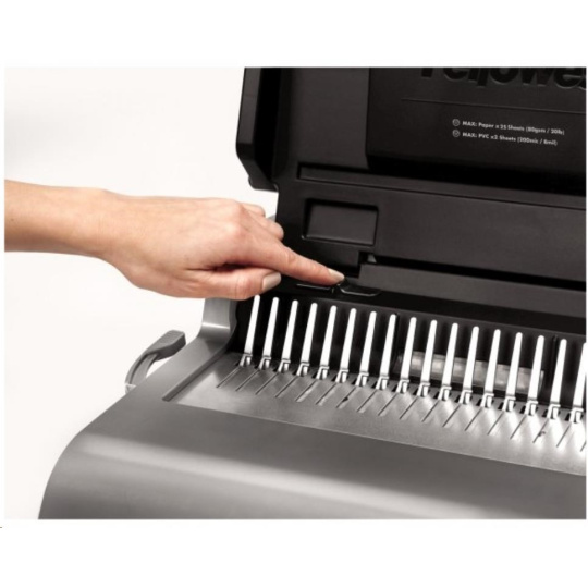 Špičkový dizajn, funkčná presnosť a komfortná obsluha sú vlastnosti tohto vazača s elektrickým pohonom děrovacieho nástroja. Děrovací kapacita až 25 listov 80 g papiera. Kapacita vazby až 500 listov. Je optimálnou voľbou pre pohodlnú prácu pri kancelárskom použití. Vkladanie děrovaných listov shora a presné nastavenie dorazu zväzku významne pomáha zabezpečiť jeho bezchybné perforovanie.