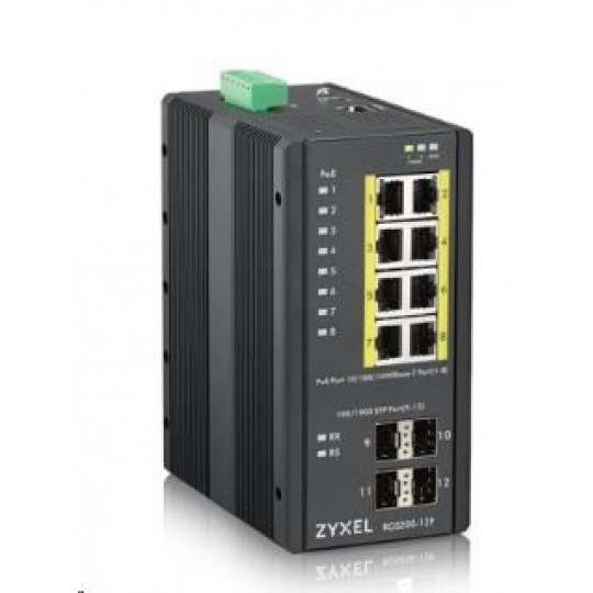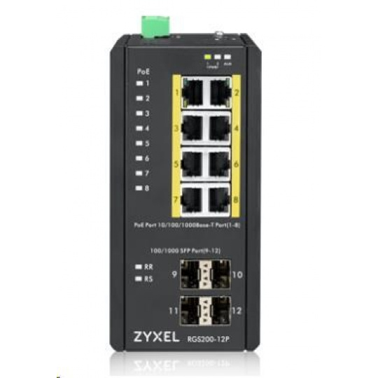 Zyxel RGS200-12P 12-portový gigabitový WebManaged PoE switch, 8x GbE + 4x SFP, rozpočet PoE 240W, montáž na DIN lištu/na stenu, IP30